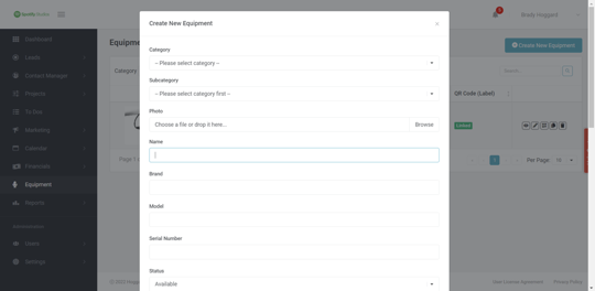 NOTE: If you add this equipment via a mobile device, it may be easier to simply take a photo of the equipment and attach to the new equipment while creating the record. - Name (required) – you will give your equipment a name. It is recommended that each piece of equipment has a unique name, but you may find that you have identical equipment with the same name, in which case the Serial Number will become a unique identifier.