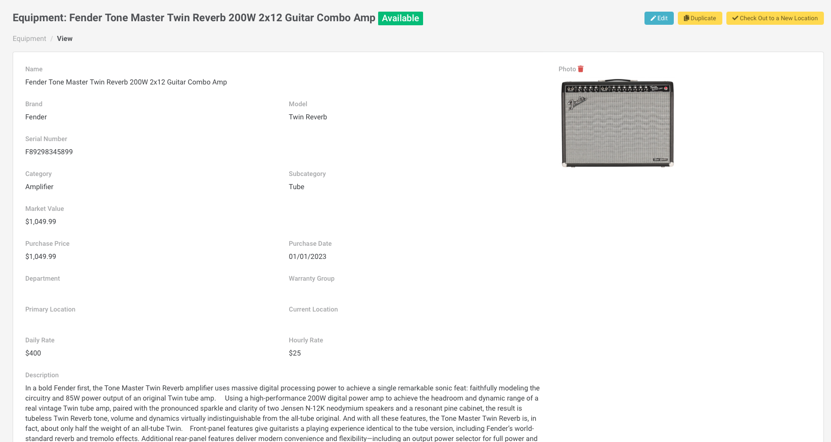 - Category (required) – you will select the appropriate Category for the piece of equipment. The options in this field should represent a high-level category, such as Microphone, Piano, Guitar, etc. The options within this list may be managed within the Picklist Manager in your account Settings.