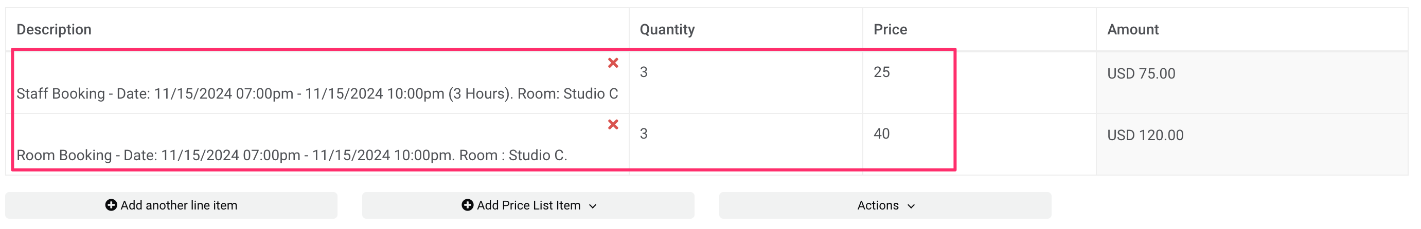 The Invoice automatically generates the relevant booking details for both the room and any team members assigned. For example, a booking was created as a 3-hour session in Studio C. In saving the booking and selecting "Save & Create Invoice", a line item was created for the "Staff Booking", which includes the booking date, time, room and the name of the assigned team member in the Description field; the Quantity field indicates the total hours in the session, and the Price field populates with the User's Rate - all of this calculating to the total Amount field. If you have multiple users assigned to a booking, there will be one line item for each user in the Invoice.