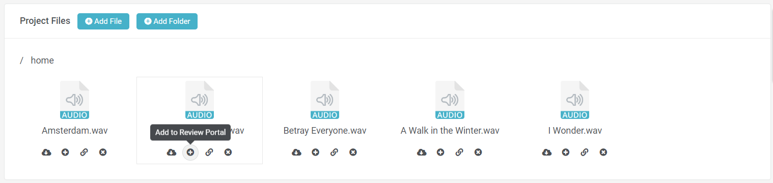 Within your project, scroll down to the Project Files section where you see all files uploaded to your Sonido project. Under each audio file, you will see a "+" icon that displays "Add to Review Portal" with a mouse hover.