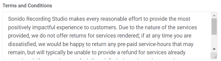 TERMS AND CONDITIONS - The Terms and Conditions field can display any details related to your studio terms for sessions, payment, etc. You can enter your company Terms and Conditions within the Company Settings, which will automatically populate in this field within all Quotes and Invoices when created so that you don't have to enter these details manually every time.