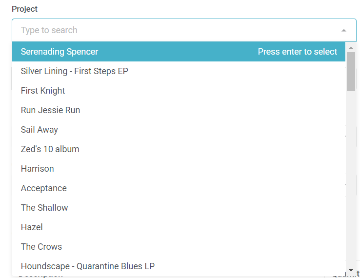 PROJECT - Invoices are tied to Projects from Sonido. In order to create an invoice, you will need to first have the Project created or available. From the Project field, you can select from a list of any Project within your Sonido account to tie the Invoice to the appropriate record.