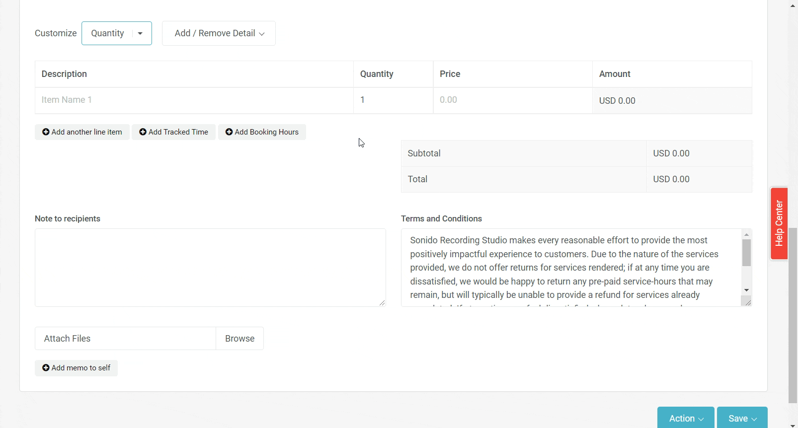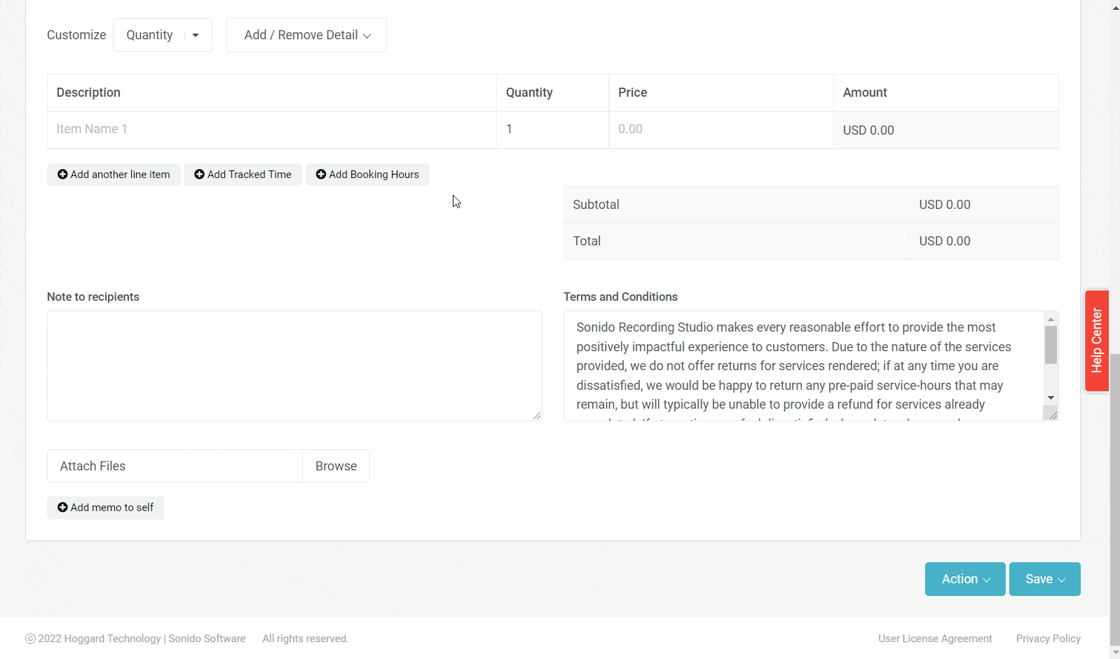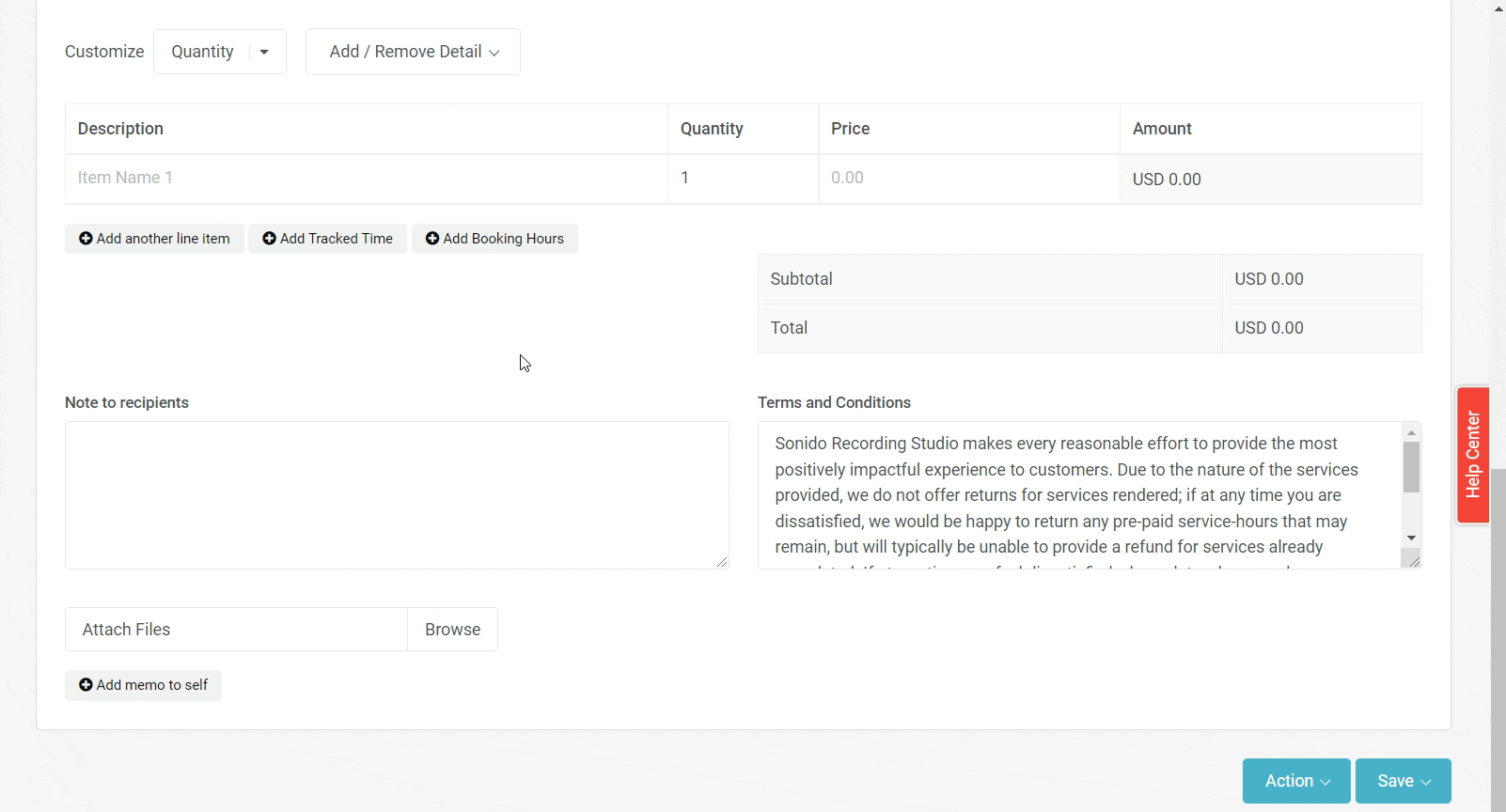 SAVE AS TEMPLATE - Within Sonido, you can save Invoices as Templates, along with all the information added to the Invoice. The "Save as Template" option in the Save dropdown allows you to save the Invoice as a Template to apply to any new Invoice in the future, which brings in all the saved data fields to save you time in composing a new Invoice.