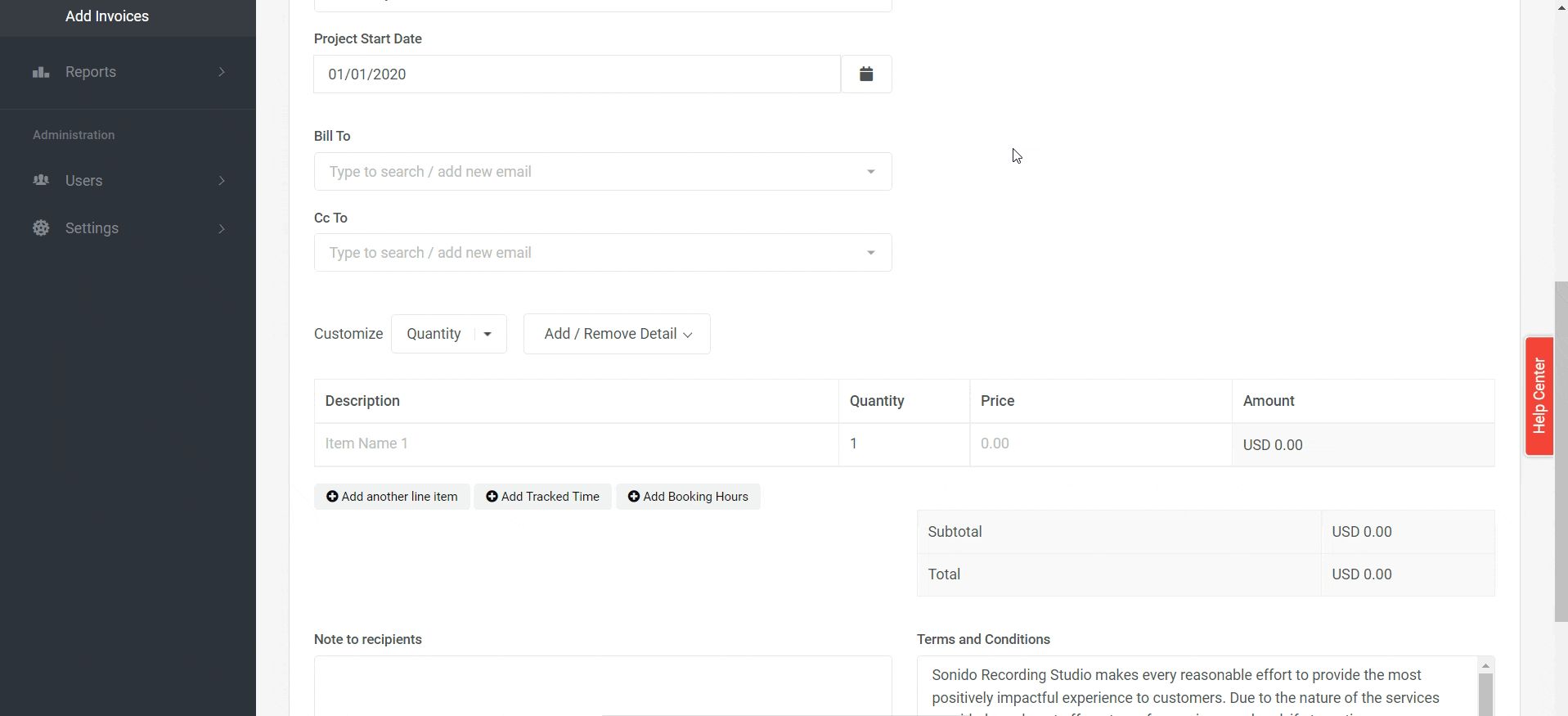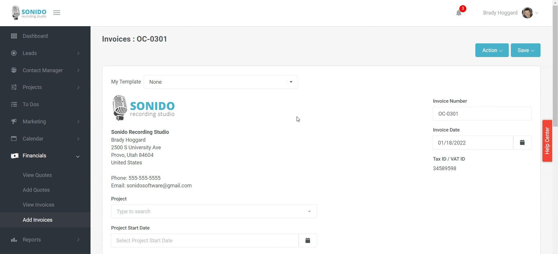 If you do not yet have the Project created, you will need to create the Project in Sonido before creating the Invoice.